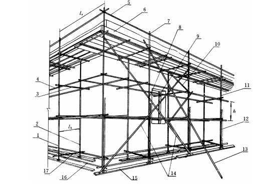结构主要指作业层、横向构架和纵向构架三部分。作业层是直接承受施工荷载,荷载由脚手板传给小横杆,再传给大横杆和立柱。横向构架由立杆和小横杆组成,是脚手架直接承受和传递垂直荷载的部分,它是脚手架的受力主体。纵向构架主要是提高脚手架的整体稳定性。