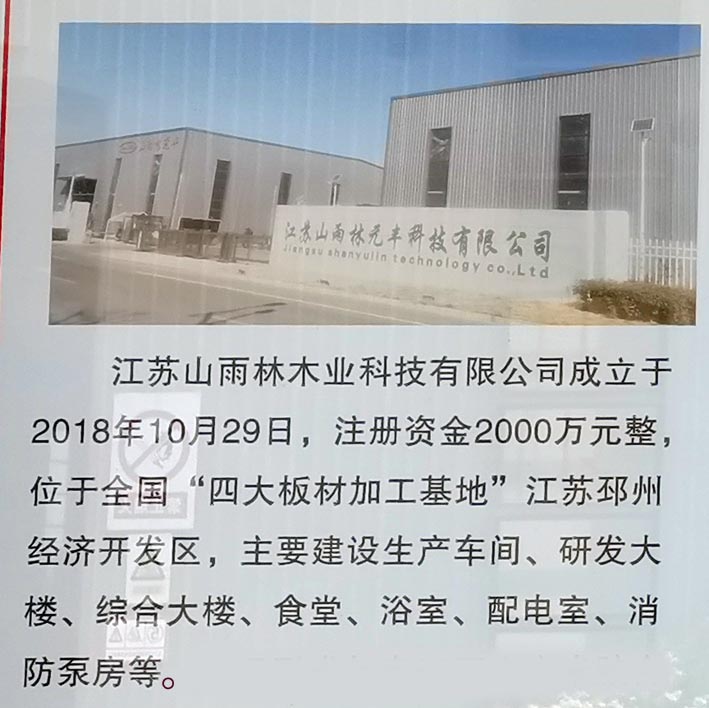 江苏山雨林木业科技有限公司成立于2018年,注册资金2000万元,位于全国“四大板材加工基地”——江苏省邳州经济开发区大晶路北侧、沂蒙山路西侧。总占地面积91098平方米,总建筑面积55953平方米,主要建设有生产车间、研发大楼、综合大楼、职工食堂、职工浴室、配电室、消防泵房等,年产旋切单板12万立方米。